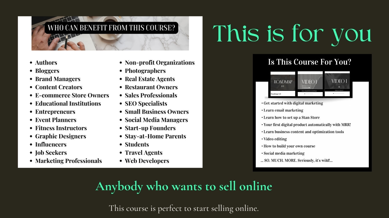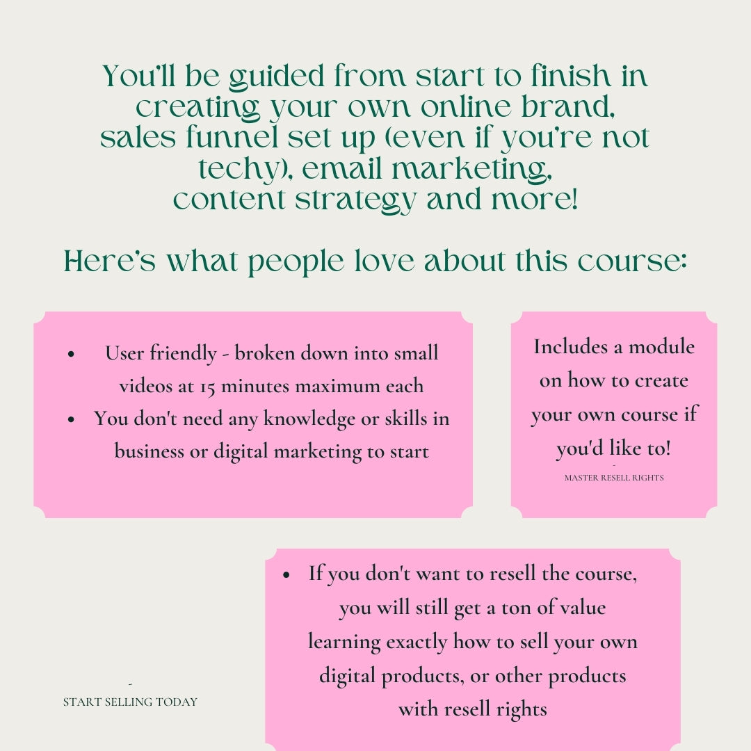 A: This digital course provides you with all the essentials to kickstart your online digital marketing business effortlessly. It's the ultimate 'ready-made' solution for those looking to sell digital products and generate extra income online, without getting bogged down by the technical intricacies of course creation.